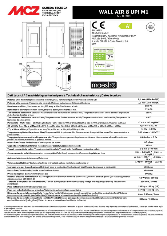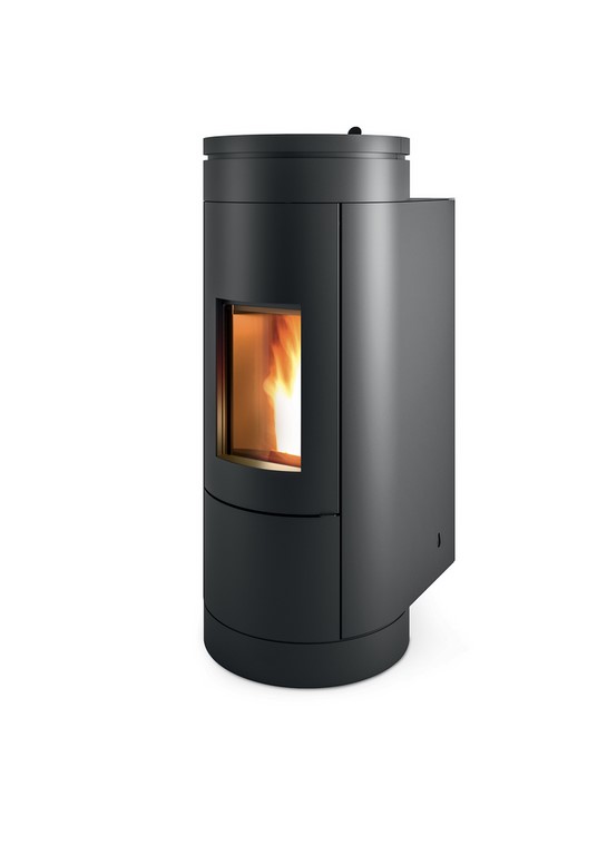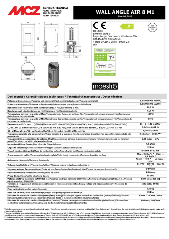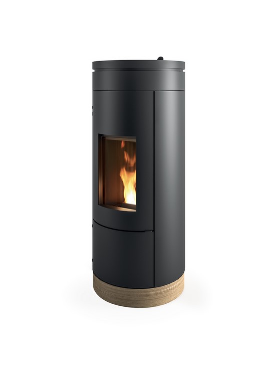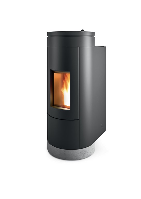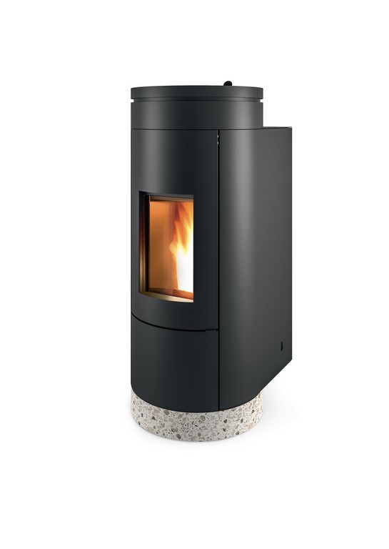 Poêle à pellets air - puissance 8.1 kW - existe en versions up (évacuation par le haut) et angle - Maestro - Flamme verte 7 étoiles - habillage black, beton grey, stone, terrazzo, ou wood.